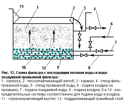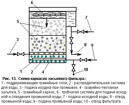 Различают два типа фильтров с зернистой загрузкой: гравийные с восходящим потоком воды и каркасно-засыпные. Оба типа фильтров обладают повышенной грязеемкостью, так как фильтрация в них осуществляется через загрузку с убывающей крупностью. В песчано-гравийных фильтрах загрузка выполняется из речного песка крупностью 1,2-2 мм высотой 1,4 м и из гравия крупностью 5-40 мм высотой 0,4 м (Рис. 12). В каркасно-засыпных фильтрах (КЗФ) загрузка состоит из каркаса (гравий крупностью 40-60 мм) высотой 1,8 м и засыпки (песок крупностью 0,8-1 мм) высотой 0,9 м. КЗФ представляет собой двухслойный фильтр с нисходящим потоком воды (Рис. 13).