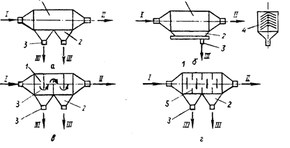Необходимо стремиться к созданию мокрых промывателей с минимальным гидравлическим сопротивлением, работоспособных при низких расходах воды. Эффективность очистки пыли зависит от размеров улавливаемых частиц и от других свойств пыли. Необходимость концентрирования системы жидкость - твердое тело с возвратом очищенной воды на пылеулавливание, накопление в орошаемой жидкости растворимых компонентов пыли усложняет систему мокрого пылеулавливания.В общем виде процесс улавливания пыли мокрым методом представляется как перенос твердой фазы из газовой среды в жидкую и удаление последней из аппарата вместе с твердой фазой [2,3]. В зависимости от формы контактирования фаз способы мокрой пылеочистки можно разделить на: 1 - улавливание в объеме (слое) жидкости; 2 - улавливание пленками жидкости; 3 - улавливание распыленной жидкостью в объеме газа (рис. 9).