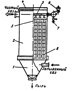 1 - бункер; 2 - корпус; 3 - диффу-эорсопло; 4 - крышка: 5 - труба раздающая; 6 - секция клапанов: 7 - коллектор сжатого воздуха; 8 - секция рукавов.