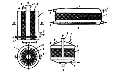 а - вертикальный; б - горизонтальный; в - кольцевой; 1 - адсорбер: 2 - слой активированного угля; 3 - центральная труба для подачи паровоздушной смеси при адсорбции; 4 - барботер для подачи острого пара при десорбции; 5 - труба для выхода инертных по отношению к поглотителю газов при адсорбции; б - труба для выхода пара при десорбции.