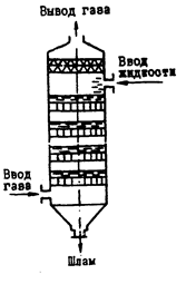 При объемно-жидкостном способе поток запыленного газа пропускают через определенный объем жидкости. Для этой цели используют пенные пылеуловители с провальными тарелками или тарельчатые скрубберы, эффективность которых может достигать 90-95%. На рис. 10 представлен тарельчатый скруббер.