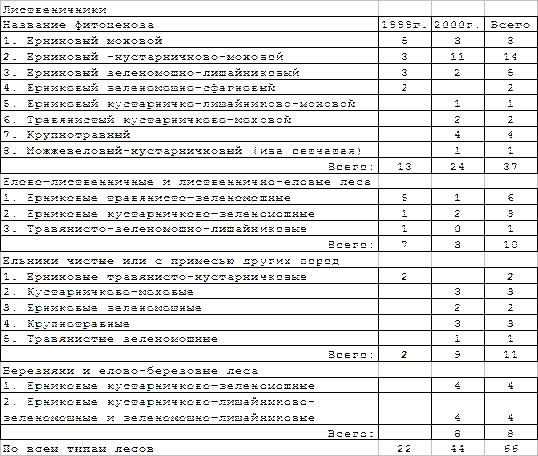 Таблица 2. Различные лесные фитоценозы, описанные в 1999-2000 г.г. в бассейне верхней Лемвы. Таблица 3. Данные по пробным площадам, отбитым в лиственничниках (1999-2000 г.г.) Таблица 4. Данные по модельным деревьям пробных площадей в лиственничниках. М-1 и М-2 – 2,7 км к югу от пробы 1 («Лиственичное»). Диаметр у корневой шейки, обе усыхающие, взяты только на возраст. Остальные на ход роста. Таблица 5. Учет подроста по пробным площадям в лиственичниках. Список литературы