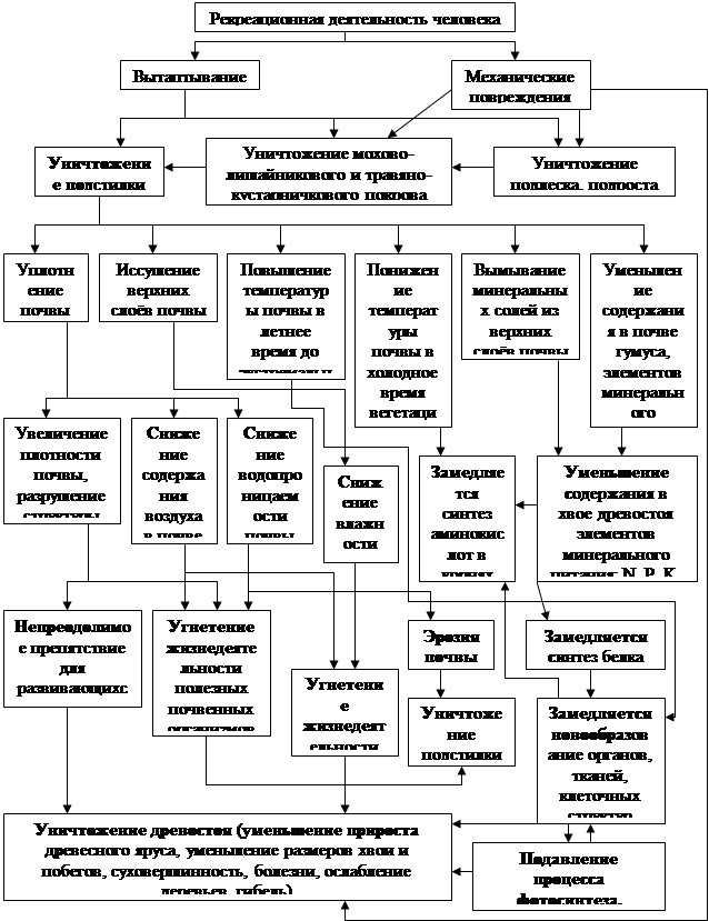 Одно из тревожных явлений последних лет – усыхание лесов: новый вид разрушения. Ведущий к нарушению всех внутриэкосистемных связей и к гибели лесной экосистемы. Начало заболевания леса, как правило, связывают с угнетающими действиями промышленного загрязнения окружающей среды: кислотные дожди, токсические вещества, содержащиеся в воздухе, а так же влиянием климатических факторов или даже микро волн, электрическими токами высокого напряжения и радиоактивностью. На ослабленных деревьях значительно увеличивается количество насекомых-паразитов, болезнь усиливается, больных деревьев становится больше. Возрастает опасность лесных пожаров, учащаются ветровалы в лесу, ухудшается качество древесины. Экосистема начинает деградировать и в конце концов погибает. Большие масштабы и высокие темпы нарушения лесов, разнообразие обуславливающих их причин затрудняет проведение конкретных лесоохранных мероприятий. К постоянным причинам деградации лесов относятся и повреждения дикими животными, выпас скота, особенно крупнорогатого[4] . С давних времён лес всегда привлекал к себе большое количество охотников, сборщиков ягод и грибов и просто желающих отдохнуть. С развитием в нашей стране массового туризма количество посетителей леса, настолько возросло, что превратилось в фактор, который нельзя учитывать при охране леса. Миллионы людей в летнее время, особенно в субботние и воскресные дни, выезжают в пригородные леса, чтобы провести свои выходные дни или отпуск на лоне природы. Тысячи туристов совершают походы по одним и тем же маршрутам. В пригородных лесах нередко можно встретить целые палаточные городки с многочисленным населением. Посетители леса вносят крупные изменения в его жизнь. Для установки палаток рубят подрост, снимают, ломают и губят молодую поросль. Молодые деревья гибнут не только под кострищами, но и под топорами, а то и просто под ногами многочисленных посетителей. Леса, часто посещаемые туристами, настолько основательно захламляются консервными банками, бутылками, тряпками, бумагой и т. д., несут следы больших и малых ран, что это отрицательно сказывается на естественном лесовозобнавлении. Несут и везут букеты цветов, ветки зелени, деревьев, кустарников. Спрашивается, что же будет, если каждый из приходящих в лес сорвёт только по одной ветке, одному цветку? И не случайно после ряда лет браконьерского отношения к природе в наших, особенно пригородных, лесах не стало многих когда-то в изобилии растущих растений, кустарников и деревьев. Весной десятки тысяч горожан устремляются в леса за черёмухой, сиренью. Не удовлетворяются скромными букетами. Охапки, веники, зачастую на крышах автомобилей. Как тут не позавидовать тонкому вкусу японцев, которые считают, что букет испорчен, если в нём долее трёх цветков. Не последние место в нанесение ущерба занимает обычай украшения новогодних ёлок. Если принять, что одна праздничная ёлка приходится на 10-15 жителей, то становится ясно каждому, что, к примеру, большому городу эта уютная традиция обходится ежегодно в несколько десятков, а то и сотен тысяч молодых деревьев. Особенно страдают малолесные районы. Присутствие даже одного человека не проходит для леса бесследно. Сбор грибов, цветов и ягод подрывает самовозобновление ряда видов растений. Костёр на 5-7 лет полностью выво
