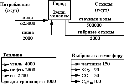 Стрелочками 1, 2, 3, 4 обозначены потоки отходов: газообразных, жидких, твёрдых, энергетических. Отходы производства – это остатки материалов, сырья, полуфабрикатов, образовавшиеся в процессе изготовления продукции и утратившие полностью или частично свои полезные или физические свойства. Пример: продукты, образовавшиеся в результате физико-химических производств сырья. Различают возвратные и безвозвратные отходы производства. Безвозвратные – это отходы, которые (нельзя переработать) не могут быть использованы в производстве на данном развитии промышленности. Отходы производственного потребления – это непригодные для дальнейшего использования по прямому назначению и списанные в установленном порядке машины, инструменты и предметы промышленного отношения. Пасса обмен современного промышленного города.