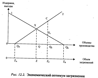 Однако при увеличении объемов производства свыше Qa и соответственно росте загрязнений более количества А, свыше ассимиляционной емкости среды возникают экстернальные издержки, налагаемые на общество. Теория экономической эффективности предполагает, что загрязнитель (предприятие, фирма, государство и т.д.) должны полностью компенсировать экологический ущерб, наносимый их деятельностью. Это создает стимулы для сокращения ущерба от загрязнения по крайней мере до того уровня, где предельные издержки сокращения загрязнения для производителя будут равны предельному ущербу, причиняемого этим загрязнением. Рассмотрим проблему нахождения экономического оптимума загрязнений. Это понятие не означает, что загрязнений вообще не должно быть, и они все нейтрализуются. К сожалению, в экономической действительности это невозможно, так как чем больше улавливается загрязнений, тем дороже обходится борьба с каждой последующей единицей загрязнения. Тем самым для полной ликвидации загрязнений потребуются колоссальные затраты и легче будет вообще ничего не производить. Речь должна идти об определенных условиях, при которых достигается экономический оптимум между эффективностью производства и экстернальными издержками, экологическим ущербом. На рисунке 2 показывается возможное определение экономического оптимума загрязнений.