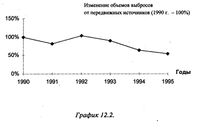 Загрязнение атмосферы Атмосфера испытывает загрязнение в основном от химических веществ, поступающих в нее на различных стадиях производства и утилизации продукции. Эти вещества находятся в газообразном, жидком и твердом (пыль, сажа и т.п.) состоянии. Ввиду большой опасности выделяют также радиоактивное загрязнение веществами (изотопы радона, стронция, плутония), находящимися в форме газов или взвешенных частиц. Кроме того существует тепловое загрязнение, образующееся в результате антропогенной деятельности и влияющее на температурный баланс, загрязнение шумом, образующееся в результате работы техники, транспорта, бытовых приборов и, наконец, — электромагнитное загрязнение из-за функционирования телерадиостанций, радиолокационных установок, линий электропередач высокого напряжения. Загрязнение атмосферы химическими веществами — наиболее существенный фактор общего загрязнения. Как уже говорилось, его источниками могут быть как стационарные установки, так и транспортные средства. Всего от стационарных источников в РФ (как правило, это предприятия) в последнее время выбрасывается более 20 млн т загрязняющих веществ в год, 80% которых находятся в газообразной или жидкой форме. Это — чистый выброс, получающийся после улавливания большей части загрязнителей. Показатель улавливания достаточно высок, он составляет около 75 % от общего количества отходящих загрязняющих элементов. Иными словами, если бы технологий улавливания не существовало бы, ежегодный выброс химических веществ .достиг бы размеров примерно в 100 млн т. Нужно сказать, что объем 'выбросов от стационарных источников в последние годы уменьшается ; (в 1990 г. было выброшено 34 млн т), что в первую очередь является 'следствием падения объемов производства, а не решающих успехов в деле охраны окружающей среды. Однако, как следует из графика1., производство сократилось в большей степени, чем выбросы. Это подтверждает тезис о том, что бороться с загрязнением методами простого закрытия предприятий или сворачивания отдельных отраслей малоэффективно. Без структурной перестройки, изменения технологий оставшиеся предприятия могут даже увеличить выбросы в масштабах страны как абсолютно, так и относительно за счет старения основных средств, в том числе и экологического назначения.