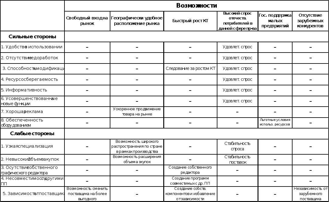 III.Производство.1. Зависимость от поставщика материалов. Некоторые компоненты изготовляемого продукта напрямую зависят от поставщика, которые также являются нашим конкурентом. Такой парадокс часто встречается на рынке КТ, где конкуренты зачастую зависят друг от друга (иногда эта проблема снимается объединением компаний-конкурентов). 2. Оборудование. Обеспечены. Для производства нашего ПП данное оборудование достаточно современно. IV.Экономическая среда.1. Государственная поддержка. Существует поддержка малых предприятий. 2. Налоговая система. Несовершенна. V.Технологическая среда.1. Развитие. Быстрое развитие КТ. 2. Внедрение. Внедрение КТ в производство замедленное из-за несоответствия цен на ПП и покупательских возможностей производителей. Проанализировав таблицы, сделаем следующие выводы. Благодаря свободному входу на рынок появляется возможность сменить поставщика на более выгодного. А географически удобное расположение рынка при использовании хорошей рекламы поможет ускоренному продвижению товара на рынок. Кроме того, возникает шанс сгладить некоторые слабые стороны – широко распространить ПП по стране в рамках своей специализации и следовательно расширить объем закупок. Способность ПП к модификации поможет оперативнее подстроиться к быстрому росту КТ. Также совершенствование КТ позволит избавиться от некоторых слабых сторон, т.е. мы сможем создать собственный редактор, обеспечить совместимость с другим ПП, разработать собственные компоненты, тем самым исключив зависимость от поставщика. Большинство сильных сторон способствует удовлетворению спроса отечественных потребителей в данной сфере производства. Данный спрос обеспечит стабильность поставок и сгладит особенности применения ПП. Государственная поддержка малых предприятий позволит использовать ресурсы на льготных условиях, а также компенсирует такую угрозу как несовершенство налоговой системы. Отсутствие зарубежных конкурентов дает нам независимость от зарубежного поставщика, что снижает объем расходования ресурсов. Такая сильная сторона ПП как «способность к модификации» компенсирует деновацию и увеличит ЖЦТ. Практически все сильные стороны дадут нам выгодные преимущества перед конкурентами. Хорошая обеспеченность оборудованием позволит быстро модифицировать продукт, а значит увеличить ЖЦТ. В нашей стране существует такая угроза как медленное внедрение КТ в производство, но ее можно несколько снизить – усовершенствованные и новые функции позволят применить ПП на новом оборудовании, а узкая специализация станет сильной стороной т.к. обеспечит целенаправленное внедрение. Применяя при этом эффективную рекламу и рассказывая о качестве товара, мы можем сгладить фактор «привычки». Фактор «привычки» – это привыкание пользователя к старым ПП и нежелание тратить деньги на новые, более эффективные. Многие слабые стороны усиливают преимущества конкурентов, но избавиться от этих сторон можно с помощью имеющихся возможностей. Так, например, такую слабую сторону как «отсутствие собственного графического редактора», которая, несомненно, снижает конкурентоспособность ПП, можно исправить созданием собственного редактора, благодаря росту КТ. Таким образом сопоставив сильные и слабые стороны с возможностями и угрозами, мы не обнаружили