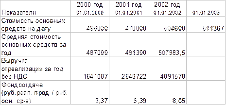 Мы видим, что уровень рентабельности также постоянно растет. Поэтому для расчета примем значение рентабельности 2002 года – 11,59%. Здесь мы также принимаем допущение о постоянстве уровня внереализационных и операционных доходов и расходов. Таким образом, приобретение основных средств и увеличение выпуска продукции увеличило бы балансовую прибыль на : 4 810 817 руб. х 11,59 % = 557 574 руб. , а чистую прибыль на : 557 574 – (557 574 х 24%) = 423 756 руб. . Однако, это не окончательное значение прироста прибыли, как могло бы казаться на первый взгляд. Дело в том, что привлекаемые ресурсы – платные. Ставка по кредитам сроком на 1 год сейчас равна около 20% годовых. Выплата процентов уменьшит экономический эффект от покупки и эксплуатации дополнительных основных средств. Кроме этого, важно учесть необходимость увеличения оборотных средств для загрузки дополнительного оборудования. Рассчитаем соотношение оборотных и основных средств предприятия. Таблица 4 Динамика основных и оборотных средств предприятия