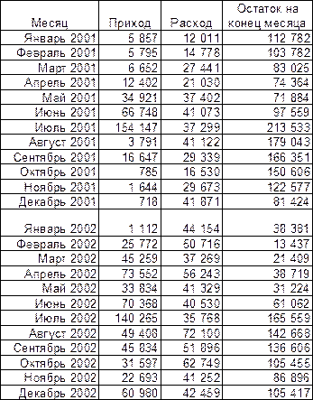 Рис. 3 График остатков основных материалов на складе. На Рис. 3 мы действительно видим сильно изменяющийся остаток основных материалов на складе. Вычислим размах вариации за два года. Для этого рассчитаем средний остаток материалов на складе по формуле средней хронологической : ½ Мянв.01 + Мфев.01+ … + Мнояб.02 + ½ Мдек.02 Мср = 23 месяца В расчете участвуют 23 месяца, а не 24 месяца потому, что январь 2001 года выпадает, как не имеющий остатка на начало месяца (вернее, из-за недостатка информации). Взять общий остаток производственных запасов на начало 2001 года из баланса было бы неправильно из-за несопоставимости данных (основные материалы являются частью производственных запасов). Мср = 2 294 664 / 23 = 99 768 руб. Теперь мы можем рассчитать размах вариации по формуле : (Mmax – Mmin) / 2 v = Мср v = ( 213 533 – 13 437 ) / 2 / 99 768 х 100% = 100,2% Мы получили очень большое число. Это означает, что поставки материалов крайне неритмичны и средний остаток материалов за двухлетний период не несет какого-нибудь серьезного экономического смысла. Велик размах вариации и по годам : Мср2001 = 123 621 руб. Мmax = 213 533 руб. Mmin = 71 884 руб. v2001 = (213 533 - 71 884) /2 / 123 621 х 100% = 57% Мср2002 = 77 903 руб. Мmax = 165 559 руб. Mmin = 13 437 руб. v2002 = (165 559 - 13 437) / 2 / 77 903 х 100% = 98% Выясним причины столь больших колебаний остатков материалов на складе. Построим график поставок и расхода материалов и совместим его с графиком остатка материалов (Рис.4). На данном рисунке мы видим, что скачок запасов материалов на 01.08.2001 г. (31.07.2001 г.) явился следствием скачка оприходованных материалов в июле 2001 г. . Закупки материалов в 4 раза превысили их расход в этом месяце. Запас же на конец месяца обеспечил бы производство той же интенсивности на 6 месяцев. Рассчитаем среднемесячный расход (РМср) материалов в 2001 году. Расчет по формуле простой средней величины : РМср2001 = ∑РМ / 12 = 349 570 / 12 = 29 131 руб. Рассчитаем длительность обеспечения производства сделанными в июле 2001 года закупками : 154 147 / 29 131 = 5,3 месяца Рост же запасов начался на месяц раньше – в июне 2001 года. В этот месяц (июнь) приход материалов на 63% превысил расход материалов. В общем за два месяца было приобретено материалов на 7,6 месяцев работы: (66 748 + 154 147) / 29 131 = 7,6 Запас на конец июля обеспечивал предприятие также на 7 месяцев работы : 213 533 / 29 131 = 7,3 Надо сказать, что период июнь-август 2001 года были месяцами наибольшего потребления. Но даже если взять реальный, а не среднемесячный расход за месяцы, начиная с июня 2001 года включительно, то мы увидим, что закупленного количества хватило бы на 6,5 месяцев. То есть, такой рост закупок не оправдан даже из соображений сезонности. Рис. 4 Динамика поставок, расхода и остатка материалов на складе в 2001 году. В 2002 году наблюдается подобная картина (Рис. 5). Рис. 5 Динамика поставок, расхода и остатка материалов на складе в 2002 году. Также, как и в 2001 году, скачок запасов материалов на 01.08.2002 г. (31.07.2002 г.) явился следствием скачка оприходованных материалов в июле 2002 г. . Закупки в 4 раза превышают расход за месяц : 140 265 / 35 768 = 3,9 Сделанный запас превышает расход за июль 2002 г. в 4,6 раза : 165 559 / 35 768 = 4,6 Рассчитаем среднемесячный расход (РМср) материалов в 2002 году. РМср2002 = ∑РМ / 12 = 576 465 / 12 = 48 039 руб. Рассчитаем срок, на который предприятие обеспечили оприходованные в июле 2002 года материалы : 140 265 / 48 039 = 3 месяца Рост запасов, как и в предыдущем году, начался в июне. В этот месяц (июнь) приход материалов на 63% превысил расх