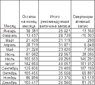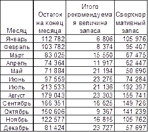 В таблице 15 мы видим, что во всех месяцах, за исключением периода февраль-апрель 2002 года, фактические запасы намного превышают рекомендуемые. Как и для 2001 года, вычислим объем сверхнормативных запасов. Таблица 16 Расчет сверхнормативных запасов в 2002 году