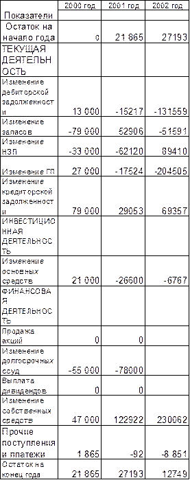 В результате превышения поступлений денежных средств над расходом на 21 865 руб. (1,5% расходов) были созданы денежные средства в таком же размере. В 2001 году рост поступлений отставал от роста платежей на 3% (74% против 77%). Однако, небольшое превышение поступлений над платежами все же сохранилось, что привело к увеличению остатка денежных средств на 5 328 руб. или 24%. Основной составляющей поступлений является выручка от реализации – 79% в 2000 году и 85% в 2001 году. Ее доля растет из-за более высокого темпа роста по сравнению с общими поступлениями (89% против 74%). Общие поступления отстают из-за медленного роста полученных авансов и падения прочих поступлений. Структура расхода более равномерна, особенно если учесть, что большая часть подотчетных сумм тратится на приобретение материалов. Показательно, что с резким увеличением закупок материалов (в 4,4 раза) , на 38% снизилась выдача подотчетных сумм. В 2002 году опережающий темп роста расходов сделал свое дело : общая сумма расходов превысила поступления на 14 444 руб. (на 1% расхода). Соответственно, на эту же сумму уменьшился и остаток денежных средств на конец 2003 года. По проведенному анализу можно сделать вывод о примерном равенстве положительных и отрицательных денежных потоках. Это наталкивает на не слишком удовлетворительную оценку деятельности, если бы не факт наличия сверхнормативных запасов материалов, подтверждаемый постоянным значительным ростом раходов на приобретение материалов (2001 г. – 4,4 раза, 2002 г. – 91%). Проведем косвенный анализ движения денежных средств в зависимости от назначения платежей и расходов. Таблица 26 Анализ движения денежных средств косвенным методом