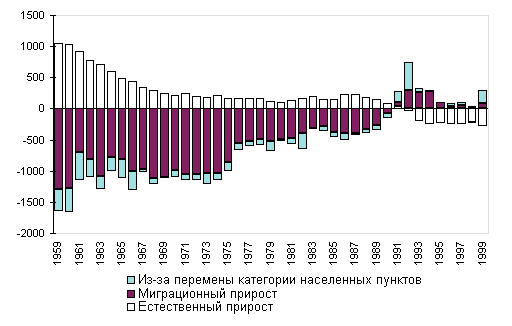 Рис. 1. Компоненты прироста (убыли) городского населения России, 1959-1999, тыс. человек Одновременно значительно сократилась доля горожан, проживающих в поселках городского типа. Общее число таких поселений, постоянно возраставшее ранее, достигнув в 1991 г. 2204, сократилось к началу 2000 г. до 1875, а численность проживающих в них - соответственно с 13,8 до 11,2 млн. человек. Большая часть поселков городского типа была преобразована в сельские поселения, некоторые были включены в черту ближайших городов 3 , а некоторые просто упразднены. Вплоть до начала 1990-х гг. рост городского населения в России происходил за счет трех составляющих: превышения числа родившихся над числом умерших, превышения числа прибывших в городские поселения над числом выбывших из них и административно-территориальных преобразований, в результате которых многие сельские жители, никуда не выезжая, становились горожанами (рис. 1). Начавшаяся в 1992 г. естественная убыль городского населения явилась основным фактором уменьшения численности горожан. Большую роль сыграло и преобразование городских поселений в сельские населенные пункты, принявшее массовый характер в 1991-1992 и 1999 гг. Одновременно шли и обратные процессы: в 1998 г. в Ставропольском крае появился новый город - Михайловск - с численностью населения почти 50 тыс. человек, в 1999 г. - Волосово (11 тыс. чел.) в Ленинградской области. Миграционный отток из городских поселений, наблюдавшийся в 1991-1992 гг., усугубил сокращение городского населения России.