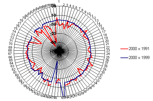 , сложившихся вокруг центров с числом жителей 250 тыс. и более, - примерно 44%. В целом за период после переписи 1989 г. сельское население увеличилось на 428 тыс. человек, или на 1,1 %, а городское население уменьшилось на 1904 тыс. человек, или на 1,8%. В результате впервые стала снижаться доля горожан. Всего лишь за 4 года - 1991-1994 - она сократилась с 73,9 до 73,0%, затем начала медленно расти, но за 1999 г. вновь сократилась - с 73,2 до 72,9%. В отличие от предыдущих десятилетий доля крупнейших городов снизилась и увеличилась доля городов, насчитывающих от 10 до 500 тыс. жителей. Не последнюю роль в этом сыграло открытие в середине 1990-х гг. данных о численности населения ряда закрытых административно-территориальных образований 2 , среди которых 20 городов с общим числом жителей 999 тыс. (от 12,9 тыс. чел. в г. Островном Мурманской области до 119,3 тыс. чел. в г. Северске Томской области). Всего в таких поселениях проживает 1163 тыс. человек. За 1999 г. их совокупное население выросло на 0,9 тыс., а за 1995-1999 гг. - на 60,4 тыс. человек.
