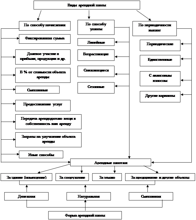 Следует различать виды арендной платы как способа начисления платежей и формы ее, т.е. внешнее материально-вещественное или стоимостное их воплощение (схема № 10).