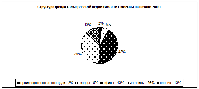 Правительство Москвы утвердило баланс нежилых зданий и помещений г. Москвы по состоянию на 01.01.2000г. Общая площадь нежилых помещений, находящихся в собственности г. Москвы составляет 46,7 млн. кв. метров, из них лишь около 8,5 млн. кв. метров (порядка 18,2%) город официально сдает в аренду. Остальные нежилые помещения, расположенные в г. Москве, являются федеральной собственностью, а также находятся в собственности юридических и физических лиц. Часть нежилых помещений г. Москвы используется для коммерческих целей. Структура фонда коммерческой недвижимости г. Москвы по состоянию на начало 2001 года представлена ниже на диаграмме № 2: