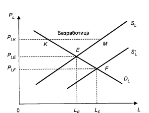 Рисунок 2 – Неоклассическая модель безработицы Предложение труда на рынке рабочей силы SL также зависит от реальной заработной платы: чем выше РL, тем больше работников предложат на рынке свой труд, и, напротив, чем ниже заработная плата, тем меньшее их число будет желать устроиться на работу. Поэтому предложение труда рассматривается как возрастающая функция от реальной заработной платы и кривая предложения труда имеет положительный наклон: SL=f(PL). (2) Соединив графики спроса и предложения, получим неоклассическую модель рынка труда, показывающую, что все желающие работать могут найти работу при сложившейся равновесной ставке заработной платы РLE. Если предложение труда возрастает (сдвиг кривой SL в положение S’L), то это приводит к снижению заработной платы до РLF и равновесие на рынке труда устанавливается в точке F. Таким образом, в неоклассической модели рыночная экономика способна использовать все трудовые ресурсы, однако лишь при условии гибкости заработной платы. Полная занятость в данном случае означает, что каждый желающий продать определенное количество труда по сложившейся в данный момент ставке заработной платы может осуществить свое желание. Если же заработная плата РLK установится выше рыночного равновесного уровня (по требованию профсоюзов или при государственном вмешательстве), то это приведет к тому, что спрос на труд будет значительно меньше предложения труда и определенная часть работников окажется без работы. Число безработных показан на отрезке КМ. Следовательно, в неоклассической модели безработица реальна, но она не вытекает из законов рынка, а возникает как результат их нарушения, вмешательства в конкурентный механизм либо государства, либо профсоюзов, т.е. нерыночных сил. Эти силы не дают упасть заработной плате до равновесного уровня, в силу чего предприниматели не смогут всем желающим предложить работу по требуемой ставке оплаты труда[4, c.165]. Поэтому, по мнению неоклассиков, в рыночной экономике может быть только добровольная безработица, т. е. такая, которая вызывается требованиями высокой заработной платы. Работники сами выбирают безработицу ради более высоких заработков. Если государство регулирует уровень заработной платы, то нарушает конкурентный рыночный механизм. Отсюда и требования экономистов этого направления — для устранения безработицы надо добиваться конкуренции на рынке труда, гибкости заработной платы. Неоклассическая концепция добровольной безработицы, изложенная в книге А.Пигу, стала предметом серьезной критики Дж. Кейнсом в его фундаментальной работе "Общая теория занятости, процента и денег". Кейнсианская теория занятости сформировалась в основном в 30-х годах XX века. Она связывается с именем английского экономиста Дж М Кейнса, наиболее выдающегося исследователя в области макроэкономики. Кейнс является родоначальником современной теории занятости. В 1936 г в своей работе "Общая теория занятости, процента и денег" он предложил принципиально новое объяснение безработицы. Кейнсианская теория занятости резко отличается от классического подхода. Жесткий вывод этой теории состоит в том, что при капитализме не существует никакого механизма, гарантирующего полную занятость. Полная занятость скорее случайна, а не закономерна[6, c.131]. Классики не видели в безработице сколь-н