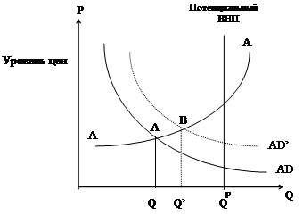 Совокупный спрос обозначает объем производства по кейнсианскому подходу . В кейнсианской модели кривая совокупного спроса подымается вверх, указывая, что объем производства растет с более высоким совокупным спросом до тех пор, пока существуют не использованные ресурсы. Если совокупный спрос недостаточный, объем производства находится в равновесии в точке А с высоким уровнем безработицы . Если совокупный спрос повышается с А D до AD, то реальный объем производства перемещается из А в В, и цены также растут. В этой кейнсианской теории с кривой AS , что подымается вверх в краткосрочный период, экономическая политика расширяющая совокупный спрос, достигает успеха в увеличении объема производства и занятости . Кейнс проанализировал факторы, определяющие динамику личного потребления и инвестиций. Согласно его теории, прирост личного потребления представляет собой устойчивую функцию прироста дохода, роль остальных факторов несущественна. С ростом доходов предельная склонность к потреблению уменьшается. Такую динамику потребления Кейнс связал с так называемым "основным психологическим законом" - уменьшением доли потребления (хотя абсолютные размеры потребления растут) и, соответственно, увеличением доли сбережений с ростом доходов. Отсюда следует, что при росте доходов доля эффективного спроса, обеспечивающаяся личным потреблением, постоянно падает, поэтому расширяющийся объем сбережений должен поглощаться растущим спросом на инвестиции. Размер инвестиций Кейнс считал главным фактором эффективного спроса. Но обеспечение нормального размера инвестиций упирается в проблему перевода всех сбережений в реальные капиталовложения. Представители классического и неоклассического направлений не видели в этом проблемы, так как исходили из предположения, что акт сбережения одновременно превращается в акт инвестирования, то есть сбережения и инвестиции равны тождественно. Традиционно считалось, что высокий уровень сбережений является условием экономического роста, поскольку именно сбережения являются источником накопления капитала. Кейнс же пришел к выводу, что чрезмерные сбережения являются фактором, препятствующим экономическому росту, поскольку избыточные сбережения - ни что иное, как избыточное предложение товара, то есть ситуация грозящая обернуться общим кризисом перепроизводства. Отсюда следовал вывод, что для поддержания постоянного национального дохода должны увеличиваться капитальные вложения, призванные поглощать все более расширяющийся объем сбережений. Именно инвестиционному компоненту принадлежит определенная роль в определении уровня национального дохода и занятости. Основным уравнением кейнсианской теории можно считать следующее равенство: GNP = C + I где GNP - валовый национальный продукт, C - потребительские расходы, I - инвестиции. На первый взгляд во взглядах и Кейнса, и представителей классического направления, инвестиции призваны поглотить объем предлагаемых сбережений. Но в классическом представлении это происходит автоматически, то есть автоматически достигается макроэкономическое равновесие. В теории Кейнса уровень сбережений определяется уровнем доходов, а уровень капиталовложений совсем другими факторами, поэтому равенство сбережений и инвестиций представляет собой скорее случ
