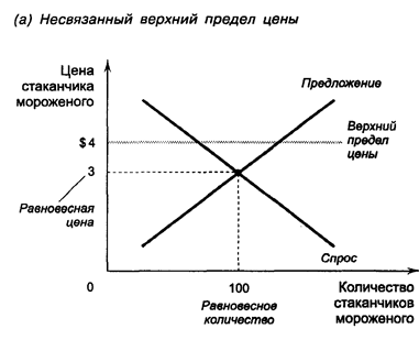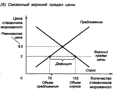 Мы имеем все основания сделать вывод: когда правительство устанавливает сдерживающий верхний предел цены на конкурентном рынке, следствием его становится дефицит товара; продавцы должны рационировать распределение ограниченного количества товара среди большого количества потенциальных покупателей. Механизм рационирования, возникающий при верхнем ограничении цены, в нормальных условиях нежелателен. Длинные очереди неэффективны, так как покупатели теряют в них время. Дискриминация, которая возникает при распределении товара по усмотрению продавца, неэффективна (потому что товар далеко не всегда получает покупатель, который его больше всего ценит) и несправедлива. Напротив, механизм распределения на свободном конкурентном рынке и эффективен и не подвержен влиянию отдельных личностей. Когда рынок мороженого достигает равновесия, все, кто желает заплатить рыночную цену, без проблем получают свой стаканчик мороженого. Свободный рынок распределяет товары с помощью цен.[13,136]