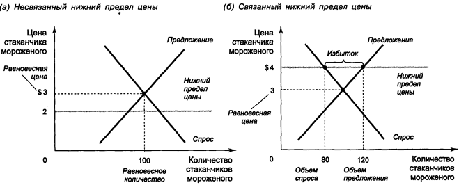 Рисунок 1.1. Установление нижнего предела цены 1.3. Влияние нижнего предела цены на функционирование рынка1.3.1. Механизм установления нижнего предела ценыЧтобы рассмотреть влияние другого вида контроля за ценами, давайте вернемся к рынку мороженого. Представьте, что правительство поддалось уговорам Национальной организации производителей мороженого и приняло решение об установлении нижнего предела цены. Определение пола цен, как и потолка, есть попытка поддержать рыночные цены на неравновесном уровне. Если верхний предел цены — официальный максимум цены, нижний предел — официальный минимум цены. Когда правительство устанавливает пол для цен на мороженое, возможны два результата. Если правительство устанавливает нижний предел цены в размере $ 2 за стаканчик, а равновесная цена составляет $ 3, мы получаем результат, представленный на графике (а) рис. 1.2. Так как равновесная цена находится выше пола цены, нижний предел цены несвязан и рыночные силы естественно движут экономику к равновесию. Нижний предел цены в этом случае не оказывает никакого воздействия на состояние рынка. График (б) рис. 1.2 иллюстрирует последствия установления нижнего предела цены в размере $ 4 за стаканчик. Так как равновесная цена составляет $ 3, пол превращается в ограничение рынка. Силы спроса и предложения движут цену в сторону равновесия, но она наталкивается на нижний предел. В этом случае рыночная цена равна нижней предельной цене. При этой цене объем предложения мороженого (120 стаканчиков) превышает объем спроса (80 стаканчиков). Производители, желающие продать мороженое, не имеют возможности реализовать его при текущей цене. Таким образом, следствие установления нижнего предела цены — избыток предлагаемой продукции. Мы упоминали, что верхний предел цены и дефицит способствуют формированию нежелательного механизма распределения. В случае существования пола рыночной цены некоторые продавцы не имеют возможности реализовать произведенную продукцию. Преуспевают те из них, кто умеет использовать личные предпочтения покупателей, основанные на расовых или семейных соображениях. Напротив, на свободном рынке основным элементом механизма распределения служит цена, а поставщики продают все, что они произвели, ориентируясь на равновесную цену.[13,140]