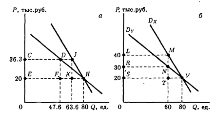 Здесь существенно то, что мы предполагаем независимость спроса на продукт Х от цены на продукт У, и наоборот. Это позволит значительно упростить демонстрацию результата. Ясно, что предельные затраты производства каждого продукта равны 20 тыс. руб. Цены, установленные по предельным затратам, покроют лишь переменную часть затрат, но не постоянные затраты в сумме 1.8 млн руб. Рассмотрим возможность установления цен на продукты выше предельных затрат таким образом, чтобы в точности покрыть и постоянные затраты. Пусть сначала мы действовали не по правилу Рамсея, а просто повысили обе цены в одинаковой пропорции так, чтобы общая выручка покрыла общие затраты. В этом случае цена каждого товара должна быть повышена до 36.3 тыс. руб. Такое решение представлено на рис. 1.6, а. В соответствии с кривыми спроса монополия реализует 47.6 ед. товара У и 63.6 ед. товара X. Это принесет превышение выручки над переменными затратами, равное сумме площадей фигур ECDF и ECJK , т. е. как раз 1.8 млн руб. Вычислим теперь потери в эффективности, вызванные таким решением. В отношении продукта У такие потери измеряются треугольником FDH, а в отношении продукта Х — треугольником KJH, т. е. соответственно 264 тыс. руб. и 133 тыс. руб., что в сумме составляет 397 тыс. руб. Возможно ли уменьшить потери в эффективности, но получить выручку, достаточную, чтобы покрыть постоянные затраты? Да. Глядя на рис. 1.6, б, заметим, что одно и то же увеличение цены, если оно касается продукта У, приносит меньше для покрытия постоянных затрат и стоит больше в терминах ущерба для эффективности, чем если оно касается продукта X. Это и неудивительно, так как спрос на продукт Х менее эластичен, чем на продукт У, поэтому разумнее увеличить цену на продукт Х в большей степени, чем на продукт У. Так мы приходим к правилу Рамсея.