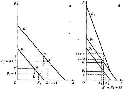 Рис. 1.7. Формирование цен в двухпериодной задаче. Будем предполагать в анализе, который следует ниже, что устанавливается достаточная мощность, чтобы удовлетворять весь спрос. Решение двухпериодной задачи оптимального ценообразования показано на рис. 1.7 (всюду нижний индекс указывает номер периода). Рис. 1.7, а показывает случай несмещающегося пика, в котором должны быть установлены цены P1 = b и Р2 = b +β; при этом попериодные выпуски Х2 > X1, а производственная мощность М = Х2. Чтобы продемонстрировать, что указанные цены оптимальны, рассмотрим цены Р2 и Р1, которые немного выше, чем заданные нами Р2 и P1. Просуммируем и сравним площади фигур, измеряющих чистую выручку продавца и излишек потребителей, для каждого случая. Для пикового периода чистая выручка, соответствующая Р2, увеличится на Р2Р2ВЕ, но излишек потребителей уменьшится на Р2Р2ВС, поэтому чистые потери в эффективности составят ЕВС. Аналогично при Р1 потери в эффективности равны KHJ. При иных отклонениях цен от Р2 и P1 будут иметь место похожие потери в эффективности. Оптимальная производственная мощность будет М = max(X1,X2), потому что при оптимальных ценах объем спроса в каждом периоде не может превысить производственной мощности. Обратим внимание на то, что в случае несмещающегося пика выручка в пиковый период (Р2Х1) покрывает затраты пикового периода: и затраты на мощность (М), и текущие затраты (P2Х2); а во внепиковый период выручка (P1X1) покрывает только текущие затраты. На рис. 1.7, б изображен случай смещающегося пика. В результате применения цен, установленных в соответствии с описанным выше правилом, пик спроса переместится из периода высокого спроса в период низкого спроса, так что X2 < Х1. Подобный результат кажется необычным и на самом деле не обеспечивает максимизации благосостояния. Правильное решение получим, просуммировав по вертикали две кривые спроса D1 и D2 и получив D Заметим, что в случае смещающегося пика потребители пикового периода оплачивают более высокую цену, чем потребители внепикового, хотя объемы поставок одинаковы в обоих периодах. Это дает основание для утверждения, что оптимизирующая благосостояние дифференциация цен по периодам может повлечь ценовую дискриминацию. В случае смещающегося пика потребители обоих периодов участвуют в возмещении затрат на мощность (β), которая полностью используется в обоих периодах. Заметим, что нет твердого правила для распределения затрат на мощность между потребителями пикового и внепикового периодов, оно зависит от относительной силы спроса в двух периодах. Если пиковый спрос возрастет относительно внепикового спроса, оптимальность потребует, чтобы потребители пикового периода оплачивали теперь возросшую долю затрат на мощность β. Но не только соотношение между спросом одного и другого периодов определяет, будем ли мы иметь несмещающийся или смещающийся пик, величина затрат на мощность в соотношении со спросом также важна. На рис. 1.7, б видно, что, если β понизится в достаточной степени, мы получим картину несмещающегося пика. И наоборот, если на рис. 1.7, а β повысится, мы можем получить случай смещающегося пика. Ясно, почему это так. Когда затраты на мощность относительно велики, неполное использование производственной мощности (как в случае несмещающегося пика) стоит дорого, что поощряет смещение пика. Таким образом, есл