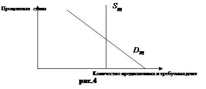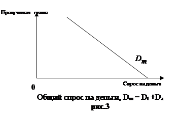 Недостаток владения деньгами, как активом, по сравнению с владением облигациями заключается в том, что они не приносят дохода в виде процента или, по крайней мере, не дают такого процента как облигации или бессрочные вклады. Некоторые банки и сберегательные учреждения обусловливают выплату процента вкладчику некоторым минимальным размером чекового вклада. В том случае, если вклады не достигают минимального размера, они не приносят процента. Процент с чековых вкладов, превышающих установленный минимум, меньше того, который уплачивается с облигаций или бессрочных вкладов. В свете этой информации приходится решать, сколько финансовых активов держать, допустим, в облигациях, а сколько в деньгах. Решение в первую очередь зависит от ставки процента. Когда процентная ставка или вменённые издержки владения деньгами, как активом, низки, люди предпочитают владеть большим количеством денег в качестве активов. Наоборот, когда процент высок, обладать значительной ликвидностью невыгодно, и количество активов в форме денег будет небольшим. Иначе говоря, когда владеть деньгами, как активом невыгодно, люди держат меньшее их количество. В том случае, когда владение деньгами выгодно, люди держат их больше. Обратная зависимость между процентной ставкой и количеством денег, которое люди хотят иметь в качестве актива, показана на рис.2.