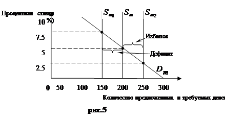 2.3 Последствия в изменении предложения денег Рассмотрим на практике, каким образом изменяются предпочтения экономических агентов при изменении предложения денег. (Данные взяты чисто гипотетически. Никаких связей с реальными показателями искать не следует). Допустим сначала, что предложение денег уменьшилось с 200 млрд. долл., до 150 млрд. долл. Заметим, что количество требуемых денег превышает количество предложенных на 50 млрд. при прежней равновесной ставке процента, равной 5. В данном случае люди попытаются приспособиться к нехватке денег путём продажи некоторых из имеющихся у них финансовых активов (примем для простоты, что эти активы являются облигациями). Но приобретение денег посредством продажи облигаций для одних означает потерю денег вследствие