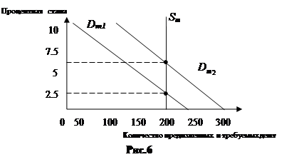 Как показано на рис.3, общий спрос на деньги можно определить путём смещения по горизонтальной оси спроса на деньги со стороны активов, на величину, равную спросу на деньги со стороны сделок. Получившаяся в результате ниспадающая прямая обозначает общее количество денег, которое люди хотят иметь для сделок и в качестве активов, при каждой возможной величине процентной ставки. Нужно обратить внимание на то, что изменение номинального ВНП, рассматриваемое через призму спроса на деньги для сделок, вызовет смещение кривой общего спроса на деньги. 2.2 Рынок денег