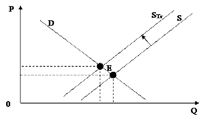 Если на отраслевом рынке правительство вводит налог на продажи, так пусть товар стоил 10 руб., то теперь его цена поднялась до 11, при 10% налоге на продажи. Здесь налог – добавка к цене. В состоянии равновесия QE