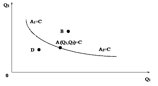 А1 = А2 = А = С, где С – некоторое значение полезности. Все Аn , принадлежавшие АА1 = С. Товарный набор В > C, а товарный набор в < C. Если нам удастся выявить все точки с одинаковой полезностью, то мы получаем кривую безразличия – ГМТ в пространстве товаров, обладающие с точки зрения потребителя одинаковой полезностью. Это понятие ввел Эджуорт.