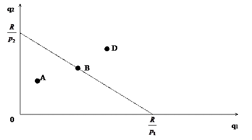 Экономический смысл: если q1 растёт, то MRS падает, а U1 стремится к 0 и U2 стремится к бесконечности Þ U1 /U2 ® 0. Общая тенденция: q1 растет ÞU1 падает ÞMRS быстро падает. Условие задачи: R– бюджет потребителя – количество денег, которым он обладает. Пусть известны цены товаров