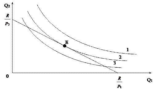 Экономический смысл: рассмотрим различные наборы товаров, которые потребитель желает приобрести: набор А – может пробрести; набор D– может; B– нет. Бюджетное ограничение делит все пространство на 3 части. Свойства: 1. Наклон бюджетной линии определяется соотношением цен. 2. Если изменится бюджетная линия, например первый товар подешевеет при ceterisparibus, при этом же бюджете потребитель сможет купить больше Þtg увеличится. 3. Если цены на товары неизменны, а R увеличится, бюджетная линия изменится, так что произойдет параллельный сдвиг прямой, угол останется тот же. При известных предпочтениях потребителя, заданной системе цен и бюджете надо определить оптимальный потребительский набор. Эта задача имеет две постановки: Условие задачи 1: I) Решение 1: Рассмотрим 3 кривых безразличия. Потребительские наборы, лежащие на 1-ой кривой недоступны. На 3-ей кривой доступны многие ситуации. На 2-ой кривой существует один набор, который можно купить. Обозначим его точкой Е. Заметим, что не существуют других наборов, которые достигают E в полезности и находятся в рамках бюджета. Все наборы на 2-ой кривой лучше, чем на 3-ей. Решением этой задачи будет точка, полученная в результате касания бюджетной линии и максимально удаленной от начала координат кривой безразличия. При заданном бюджете цель потребителя – найти максимально удаленную от начала координат кривую безразличия . Точка касания единственная, следовательно, задача решена и имеет единственное решение. Условие задачи 2: Известно предпочтение. Задан целевой уровень благосостояния. Решение задачи 2: При заданных ценах, потребительском бюджете и потребительском предпочтении существует единственный товарный набор, который доставляет наибольшую полезность при заданных условиях. Либо наоборот – обеспечивает заданную полезность при наименьшем бюджете – основная неоклассическая задача потребления. А точка Е дает нам равновесное решение или, иначе, называется равновесие потребителя. Существует правило, которое называется условие равновесия потребителя : 1) 2) отсюда Экономический смысл : предложим, потребитель осуществил закупки 1–ого и 2–ого товаров. Рассмотрим последние закупленные единицы обоих товаров. При оптимальном плане закупок предельная полезность от закупки каждого товара в расчете на единицу затрат, должна быть постоянной – правило условия равновесия потребителя.