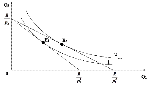 Энгеля в интерпретации Торнквиста: необходимо рассмотреть всевозможные зависимости вида Торнквист вывел, что все товары можно грубо разделить на 3 группы: · nовары первой необходимости; · в точке А – переключение спроса, т.е., начиная с уровня RA , товары первой необходимости перестают доминировать в его потребительской корзине (этот порог часто отождествил с уровнем бедности); · предметы роскоши. Их потребление начинается на достаточно высоком уровне R и уже неограниченно. В точке B предмет роскоши начинает превалировать над (2). №5. ВЛИЯНИЕ ИЗМЕНЕНИЯ ЦЕН НА ПОКУПАТЕЛЬСКИЙ СПРОС.