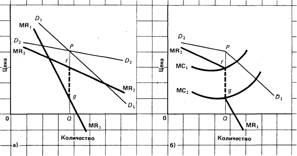 Рисунок Ломаная кривая спроса Характер кривых спроса и предельного дохода олигополиста, не участвующего в тайном сговоре, как показано в (а), будет зависеть от того, станут ли его конкуренты выравнивать свои цены по его ценам (D1 D1 и MR1 MR1 ) или игнорировать (ОгОг и MR2 MR2 ) любые изменения текущей цены PQ, которые он может предпринять. По всей вероятности, конкуренты олигополиста будут игнорировать увеличение цены, но следовать снижению цены. Это является причиной того, что кривая спроса олигополиста является ломаной ( D2 PD1 ) и кривая предельного дохода имеет вертикальный разрыв, или интервал ( fg), как показано в (б). Более того, так как любой сдвиг в предельных издержках между MC1 –и MC1 сократит вертикальный (пунктирный) отрезок кривой предельного дохода, никакого изменения ни в цене PQ, ни в объеме производства Q не произойдет. Основанная на тайном сговоре олигиполия Неопределенности, присущие не основанному на тайном соглашении ценообразованию, благоприятствуют тайному сговору. Для участвующих в тайном сговоре олигополистов характерна тенденция к максимизации общих прибылей, то есть к поведению их в некоторой степени как чистых монополистов. Различия в спросе и издержках, наличие большого числа фирм, мошенничество посредством ценовых скидок, экономические спады и антитрестовские законы являются препятствием для основанной на тайном сговоре олигополии.