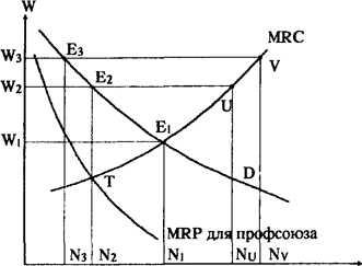 Рис. Рынок труда с профсоюзом Кривые спроса на труд и кривые его предложения для совершенно конкурентного рынка труда воспроизведены с рис. Заметим, что в условиях монополизации рынка 1 руда профсоюзом кривая MRC перестает быть кривой предложения труда (у монополии чет кривой предложения). Немного иная ситуация сложится на рынке труда, если профсоюз объединит всех работников отрасли, от высококвалифицированных до малоквалифицированных. Как правило, в таком случае профсоюз прибегает к способу установления минимальной заработной платы W3 выше равновесной W i путем угрозы объявления забастовки. Если предприниматели соглашаются со ставкой Wj руб., то формально для них кривая предложения труда превращается в горизонтальную линию W3 V, т.е. предложение труда становится абсолютно эластичным до точки V; (если спрос на труд будет расширяться дальше, то наем рабочих свыше NV должен повлечь увеличение заработной платы). Точка E3 пересечения кривых спроса на труд и его предложения для отрасли определит число занятых W3 (на рис. значения W2 и W) выбраны произвольно для наглядности изложения). Заметим, что введение профсоюзом своей минимальной границы заработной платы также формально означает снижение предложения труда, а последнее неизбежно влечет за собой неэффективное использование трудовых ресурсов. Действительно, уровни отраслевой занятости N2 и N3 ниже потенциально равновесного NI . Кроме того, напомним, что ординаты кривой MRC показывают значения предельного продукта в денежном выражении ( MRP) рабочих, занятых в альтернативных отраслях. Следовательно, по ставке W2 в текстильной отрасли могли бы трудиться ( Nu – N2 ) рабочих из иных отраслей, где ставка заработной платы ниже, но такого не происходит и общество от этого также теряет. Тот факт, что повышение заработной платы за счет уменьшения предложения труда приводит к сокращению занятости и потенциально опасно возникновением безработицы вызывает беспокойство у профсоюзов. Идеальным способом, ведущим и к росту заработной платы и к увеличению занятости, является расширение спроса на труд. Этого можно добиться, если: 1. увеличивается спрос на товары, изготавливаемые в отрасли, т.е. с использованием данного ресурса (труда); 2. повышается производительность труда в отрасли; 3. растут цены на ресурсы–заменители. Первую задачу профсоюзы могут решить, например, путем рекламы товаров своей отрасли. Решение второй задачи достижимо при соответствующих соглашениях с предпринимателями. Добиться повышения цен на ресурсы–заменители можно, положим, поддерживая борьбу за повышение минимума заработной платы в отраслях, где заняты рабочие, готовые потенциально заменить рабочих данной отрасли. Однако возможности профсоюзов добиться расширения спроса на труд ограничены, поэтому профсоюзы в целях повышения заработной платы чаще прибегают к сокращению предложения труда. Отрицательный эффект повышения заработной платы, т.е. сокращение числа занятых в отрасли, можно уменьшить, если спрос на труд станет менее эластичным. Чем ниже эластичность спроса на труд, тем меньше снижается занятость в отрасли при одном и том же повышения уровня заработной платы. Эластичность спроса на труд зависит от наличия ресурсов–заменителей. Если профсоюз достаточно влиятелен, он может противиться применению ресурсов, заменяю