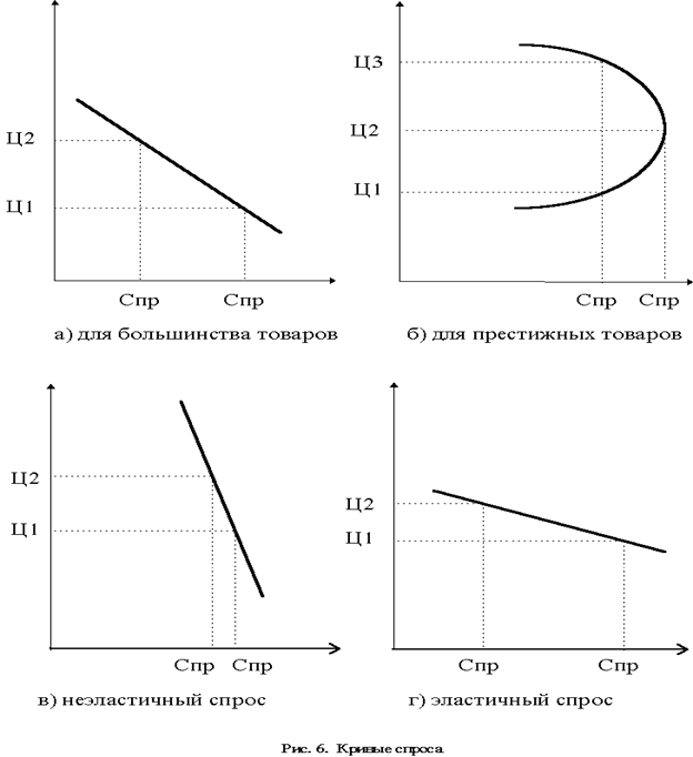 Рис. 1. Кривые спроса. Большинство фирм так или иначе стремятся проводить замеры изменений спроса. Различия в подходах к замерам диктуются типом рынка. В условиях чистой монополии кривая спроса свидетельствует о том, что спрос на товар обоснован ценой, которую фирма за него запрашивает. Однако с появлением одного или более конкурентов кривая спроса будет меняться в зависимости от того, остаются ли цены конкурентов постоянными или меняются. В данном случае мы будем считать, что они остаются неизменными (о том, что бывает, когда цены конкурентов меняются, речь пойдет ниже). Для замера спроса необходимо провести его оценку при разных ценах. При этом надо помнить, что на спросе могут сказаться, помимо цены, и другие факторы, например увеличение рекламы, и становится невозможно определить, какая часть увеличения спроса объясняется снижением цены, а какая - увеличением рекламы. Под влиянием неценовых факторов происходит сдвиг кривой спроса, а не изменение ее формы. Цена, назначенная продавцом, так или иначе отразится на уровне спроса на товар. Эта взаимосвязь объясняется двумя экономическими принципами (законом спроса и ценовой эластичностью спроса) и сегментацией рынка. 3.4. Закон спроса. Закон спроса гласит, что чем выше цена, тем меньше число тех, кто согласится купить данный товар, т. е. меньше уровень спроса (при данном уровне доходов); и наоборот, чем ниже цена, тем больше будет число покупателей и количество приобретаемого товара. Таким образом, спрос и цена находятся в обратно пропорциональной зависимости. Однако при повышении цен на престижные товары часто наблюдается увеличение спроса, так как потребители могут посчитать более высокую цену показателем более высокого качества. При слишком высокой цене спрос на престижные товары уменьшается. Большинство фирм стремится проводить замеры изменений спроса. В зависимости от типа рынка применяются различные подходы к замерам. В условиях чистой монополии спрос на товар обоснован той ценой, которую фирма за него запрашивает. Однако в условиях конкуренции кривая спроса на товар фирмы будет меняться в зависимости от реакции конкурентов на установленные цены. Допустим, необходимо произвести замер изменения спроса на шампунь фирмы “Эльсев”. В данном случае будем считать, что цены конкурентов не меняются. С уменьшением цены на шампунь спрос на него растет. Однако при цене 12 рублей спрос начинает падать, так как люди думают, что шампунь слишком дешев, к примеру, из-за нарушения условий хранения или низкого качества. На спросе могут сказаться и неценовые факторы. Например, если фирма “Эльсев” одновременно снизит цену на свою продукцию и увеличит рекламную компанию, то невозможно установить, какая часть увеличения спроса объясняется уменьшением цены, а какая -- увеличением рекламы. Необходимо также учитывать предпраздничные дни, когда наблюдается увеличение покупок не зависимо от изменения цен. Под влиянием цен происходит изменение величины спроса, а под влиянием неценовых факторов изменяется сам спрос. Изменение спроса может зависеть от положения экономики, изменении моды на товар, проведении рекламной компании многих других факторов. Таким образом, при повышении уровня спроса при прежней цене продавец может продать большее количество товара, а при уменьшении -- меньшее. Закон с