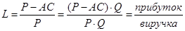 де S, — ринкова частка фірми "i" (i=1, 2, 3,..., N) у відсотках, причому Зокрема, для чистої монополії (N=1) Н=10000, а для повної конкуренціїН може бути меншим за 1 (для N=20000 однакових за часткою фірм H=O.5). Зазначимо, що об'єднання фірм веде до збільшення галузевого індексу Н, отже, до поширення монопольної влади. В paзі монопольної влади ринкові ціни перевищують граничну та середню вартість. Отже, ступінь монопольної влади можна визначити, якщо підрахувати, наскільки ціни Р перевищують рівень граничної вартості МС. Для цього варто скористатися індексом Лернера L (запропонований у 1934 р.): L = (P-МС)/Р (1) Зазначимо, що в умовах повної конкуренціїL=O. Якщо врахувати, що граничну вартість не завжди можливо визначити, у формулі (1) МС можна приблизно замінити на середню вартість АС. Toдi індекс Лернера визначається як: