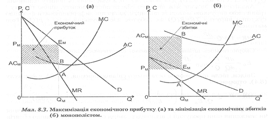 Такий зв’язок дає змогу монополістові визначати наслідки підвищення чи зниження цін продукції і, відповідно, зміни обсягів випуску щодо обсягів виручки. 5.2. Максимізація прибутку монополії. Для монополіста як і для будь-якого іншого підприємця є важливою проблема максимізації прибутку. Правда це питання фірма-монополіст розв’язує дещо інакше ніж конкурентна фірма. Головна відмінність полягає в тому, що монополіст повинен прийняти рішення і щодо обсягу випуску, і щодо ціни, тоді як конкурентна фірма визначає лише обсяг. Прибуток монополії як різниця між виручкою та загальними витратами виробництва визначається за формулою: Pr(Q) = TR(Q) – TC(Q). Із зростанням Q прибуток зростатиме, поки не досягне максимуму, а відтак почне зменшуватись. Певний обсяг виробництва максимізує прибуток в тому випадку, коли приріст прибутку від додаткового збільшення Q дорівнює нулю. Тобто коли MR=MC – це є універсально необхідною умовою максимального прибутку. Отже для монополіста після знаходження оптимального обсягу, треба визначити оптимальну ціну. Для цього слід скористатися оберненою функцією попиту Графічно розв’язок задачі ілюструє мал.2(а). Точка А відповідає умові MR=MC, її координата на осі обсягів означає монопольний обсяг Фірма-монополіст у короткостроковому періоді може мати економічні збитки, якщо навіть при виконанні умови максимізації прибутку вартість виробництва одиниці продукції перевищує її ціну. Тоді фірма може лише мінімізувати свої збитки. Цю ситуацію ілюструє мал.2(б). Умова беззбитковості має такий вигляд: Що стосується кривої пропозиції то для фірми-монополіста вона не існує. Це можна довести, якщо при незмінних кривих вартості підібрати нову криву попиту з таким нахилом, щоб відповідна їй крива граничної виручки перетиналась з кривою МС у тій самій точці А, що й крива MR і МС на мал. 2(а). Тоді обсяг 5.3. Монопольне ц іноутворення; ц інова дискрим інац ія Ціноутворення за формулами MR=MC i