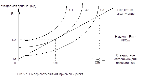 Обозначим удовлетворение вкладчика через кривые безразличия U1,U2,U3 таким образом, что U1 будет отображать максимальное удовлитворение, а U3 – минимальное. Кривые безразличия идут вверх, так как с ростом риска (Qp ) растет и ожидаемая прибыль (Rp ), которая компенсирует риск. Проведем бюджетное ограничение, показывающее взаимосвязь риска и прибыли: Rp = Rf + b(Rm - Rf ) = Rf + Rm – Rt /Qm ´ Qp (2.2.5.) Если инвестор, не желая рисковать, вкладывает все свои сбережения в государственные казначейские векселя, то b = 0 и Rp = Rf (см. рис. 2.1.). Если, наоборот, перед нами отчаянный любитель риска, который вкладывает все свои деньги в покупку ценных бумаг, то b =1, тогда Rp = Rm и при этом резко возрастет риск(см рис.2.1.). В действительности равновесие установится где-то между Rf и Rm (так как часть его средств будет вложена в акции, а часть – в казначейские векселя), например в Re при риске Qe ( в интервале от 0 до Qm )/ Эти точки Re и Qe являются проекцией пересечения кривой безраличия(которая характерна для данного индивида) с бюджетным ограничением в Е. Где именно на бюджетной прямой находится эта точка, зависит от отношения инвестора к риску.