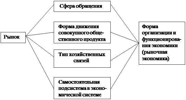 Рис.2. Характеристика понимания рынкаСущность рынкаРодовые чертыРынок является экономической категорией и как таковая тесно связан с обменом, обращением, торговлей, торговыми услугами. В чем же единство и различия связанных с рынком категорий? Обмен можно рассматривать с двух сторон: - как процесс движения товаров и услуг, как процесс общественного обмена веществ; - как процесс создания определенных общественных отношений, в которые вступают индивидуумы при этом обмене веществ. Как экономическая категория обмен выражает вторую сторону, т.е. представляет собой экономические связи между людьми, как производителями и потребителями, по поводу движения результатов труда, полученных не для собственного потребления, а для других, для удовлетворения общественных потребностей. Именно благодаря обмену разрозненные, хозяйственно обособленные товаропроизводители и потребители вступают в контакты. Товарное обращение – более развитая форма товарного обмена. Это товарный обмен, осуществляемый при посредстве денег (Т – Д – Т) на основе взаимной возмездности и эквивалентности, взаимного соглашения участников данного процесса. Торговля – это деятельность людей по осуществлению товарного обмена и актов купли – продажи. Торговые сделки товаровладельцев – продажа (обмен товара на деньги), купля (обмен денег на товар), единство обоих этих актов и заключение таких сделок составляют суть торговой деятельности. Торговые услуги – отношения посреднической деятельности людей, осуществляющих куплю – продажу товаров. К основным торговым услугам относятся такие торговые операции, как изучение покупательского спроса, товарных источников торговцами, реклама, организация различных выставок, заключение хозяйственных договоров, разовых сделок, показ товаров, оказание квалифицированной консультации, создание благоприятных условий для реализации товаров: прием, выдача и хранение денег, связанных с реализацией товаров, оформление различных документов, учет и контроль за движением товарной массы и многие другие. К дополнительным торговым услугам относятся услуги, связанные с продолжением процесса производства в сфере обращения (транспортировка, упаковка, хранение и т.д.), существование которого обусловлено полным обособлением производства от сферы обращения. Ещё бы хотелось остановиться на понятии торговый капитал. Торговый капитал – капитал, функционирующий в сфере обращения (по Марксу), представляет собой обособившуюся часть промышленного (товарного) капитала. Практически это означает, что промышленник, вкладывающий свой капитал в производство товаров, сам не занимается их реализацией, а передает эту функцию специальным торговым предприятиям. Торговый капитал становится как бы агентом промышленного, осуществляет его торговое обслуживание. Экономический смысл такого обособления состоит в том, что торговец экономит промышленнику время и деньги, ибо осуществляет реализацию товаров быстрее (лучше знает условия реализации, спрос покупателей и т.д.) и с меньшими затратами. Первоначальной формой торгового капитала был купеческий капитал, объективной основой возникновения которого послужили отделение ремесла от земледелия, а затем города от деревни. С возникновением денег и образованием местных рынков происходит выделение особ