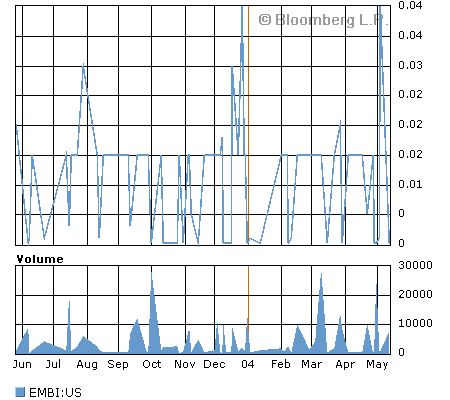 Рис. 1.2 Индекс ПФТС за 2003-2004 г.г. [15] К сожалению, в этой сфере будет ощущаться влияние достаточно весомых и, в то же время, разнонаправленных по направлению действия факторов. С одной стороны политические факторы, которые, безусловно, будут способствовать понижению рынка, с другой стороны, экономические факторы. Поскольку последние полгода мы были свидетелями доминирования как раз экономический факторов, поэтому существуют достаточно весомые основания предположить, что сила их действия будет значительной и в дальнейшем. Осталось разобраться только с тем, в каком направлении они будут двигать рынок. Макроэкономические данные заставляют думать о перспективах рынка с большой долей оптимизма. Объем промышленного производства в Украине в январе-апреле 2004 года вырос на 17,7% по сравнению с аналогичным периодом прошлого года, в том числе в апреле — на 14,1%. В финансовом секторе прибыль украинских банков, а это самые главные инвесторы отечественного рынка, за январь-апрель увеличилась на 70,5% по сравнению с аналогичным периодом прошлого года и на 1 мая составила 403,5 млн. гривен. Оживление конъюнктуры рынка можно также связывать с предстоящими приватизационными продажами. Фонд государственного имущества Украины 12 мая 2004 г., объявил конкурс по продаже 93,02% акций ОАО «Криворожсталь». За этот объект ожидается серьезная борьба среди отечественных бизнес-групп, а также нельзя исключать возможность международных инвесторов. В целом эта продажа оценивается на сумму около $1 млрд., что составляет одну двенадцатую часть государственного бюджета Украины. Очевидно, что попадание этой суммы в систему государственных финансов радикальны образом должно отразиться на конъюнктуре первичного рынка государственного долга. Таким образом, есть веские основания надеяться, что экономические факторы будут способствовать росту. Однако, как известно, в любой бочке меда есть ложка дегтя. Эта ложка – конъюнктура на внешних финансовых рынках. По данным The Wall Street Journal многие мировые инвесторы пересматривают свои планы в странах с развивающейся экономикой на оставшуюся часть года. Американские фонды, инвестирующие в emerging markets, зафиксировали на неделе, завершившейся 5 мая, отток средств на сумму $411 млн. За последние 8 недель отток средств из фондов, инвестирующих в развивающиеся экономики, происходил в течение 6 недель. Трейдеры также отмечают, что хеджевые фонды уже начали выводить средства из emerging markets. Доходы от инвестиций в страны с развивающейся экономикой сейчас также демонстрируют тенденцию к снижению. Индекс MSCI (рис. 1.3 [14]), рассчитываемый для emerging markets, с начала года опустился на 10% с максимального уровня в начале года. Облигации стран emerging markets резко упали в цене после того, как на рынке после публикации благоприятных данных о состоянии рынка труда в США усилились ожидания скорого повышения процентных ставок в Америке. Глобальный индекс J.P.Morgan EMBI+ Global (рис.1.4 [14]) упал на 2,1%, а средний спрэд по облигациям emerging markets вырос на 0,25 процентного пункта до 5,15 процентного пункта. На рис. 1.5 представлен индекс Доу-Джонса – он отражает состояние рынка огромных компаний («голубые фишки» - bluechips – компании с рыночной стоимостью больше 5 миллиардов долларов [13]).