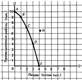Главная идея здесь сводится к следующему: в любой момент времени экономика полной занятости и полного объема производства должна жертвовать частью продукта X, чтобы получить больше продукта Y. Тот решающий факт, что экономические ресурсы редки, не позволяет такой экономике увеличивать одновременно и Х и Y. 2.3. Кривая производственных возможностей Чтобы углубить понимание таблицы производственных возможностей, рассмотрим приведенные в ней данные в их графическом изображении. Используем простой двухмерный график, произвольно разместив данные о производстве роботов (средств производства) на вертикальной оси, а данные о производстве пиццы (потребительских товаров) на горизонтальной оси, как это показано на рисунке 1. Каждая точка на кривой производственных возможностей представляет какой-то максимальный объем производства двух продуктов. Таким образом, эта кривая фактически изображает некую границу. Чтобы осуществить различные комбинации производства пиццы, роботов, показанные на кривой производственных возможностей, общество должно обеспечить полную занятость ресурсов и полный объем производства. Все сочетания пиццы и роботов на кривой представляют максимальные их количества, которые могут быть получены лишь в результате наиболее эффективного использования всех имеющихся ресурсов. Точки, находящиеся вне кривой производственных возможностей, как, например, точка W, оказались бы предпочтительнее любой точки на кривой; но такие точки недостижимы при данном количестве ресурсов и при данной технологии производства. Барьер ограниченности ресурсов не допускает какого-либо сочетания производства средств производства и предметов потребления в точке, расположенной вне кривой производственных возможностей.