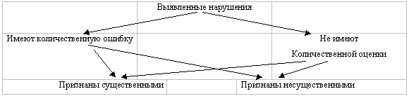 Установленный таким образом уровень существенности ошибки финансовой отчетности составит 76013 тысяч рублей. 1.7. Оценка существенности аудиторских доказательств При обнаружении ошибки аудитор должен определить ее природу (качественную сторону), а затем произвести количественную оценку погрешности. Отдельные показатели в отчетности и некоторая информация, содержащаяся в приложениях к ней, могут быть недостаточно точными. Однако на этом основании нельзя делать вывод, что отчетность в целом неточна или что она не выражает реального положения дел. Неточности могут быть вызваны: · а) ошибками в расчетах; · б) тем, что отдельные показатели являются оценочными (срок полезного использования материальных активов, безнадежная дебиторская задолженность и др.). Аудитор допускает неточности в бухгалтерской отчетности в следующих случаях: · Если неточности мелкие и не влияют на решение, принимаемое пользователями отчетности. · Если затраты на выявление и исправление мелких ошибок слишком велики. · Если время, затраченное на выявление и исправление мелких ошибок, может отсрочить публикацию бухгалтерской отчетности. В ходе проверки аудитор должен оценить существенность полученной информации. При этом также учитывается как количественная, так и качественная сторона выявленных нарушений или ошибок. Любое нарушение, выявленное аудитором, имеет в своей основе качественную природу, и в зависимости от характера нарушений может иметь или не иметь количественной оценки. Например, при применении неправильной корреспонденции счетов можно выявить завышение или занижение оборотов или остатков по счетам, а вот замечание в виде отсутствия журнала регистрации приходных кассовых ордеров вряд ли можно определить в количественном выражении. Но и в том и другом случае обнаруженные замечания можно признать и существенными и несущественными (рисунок 1). Рисунок 1. Оценка существенности аудиторских доказательств.