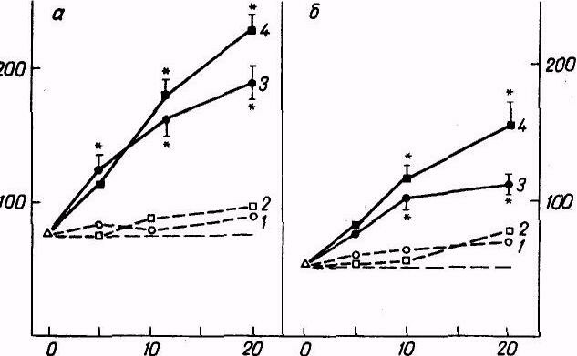 Рис.1А Связь между накоплением холестерина в клетках и временем инкубации. По оси абсцисс—время инкубации (в ч). Остальные обозначения те же, что и на рис 1