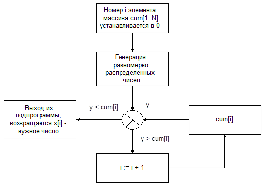 Величины шагов, углы площади разбиты равномерно от 0 до максимального значения. Значение, больше максимального в эксперименте не встречается. Значения частоты наблюдений обозначают частоту встречаемости этих шагов в произвольном измерении. В принципе, сумма частот встречаемости должна составлять 1 или 100%. Однако при реальном моделировании, поле приходится описывать в виде приблизительного распределения. При этом мы можем увеличивать или уменьшать частоты появления отдельных шагов. Если при этом заботиться о том, что суммы всех частот должна составлять 100%, то это сильно затруднит просмотр всех вариантов. После подгонки формы приблизительного распределения, программа нормализует сумму частот к 100% по формуле Таким образом формируется 3-й столбец таблицы. После формирования 3-го столбца таблицы, программа формирует 4-й столбец, представляющий собой куммулятивное распределение. В программе полученное равномерно распределенное число y последовательно начиная с 1-го сравнивается с числами четвертого столбца. При этом номер числа последовательно наращивается. Как только y превысит очевидное число из 4-го столбца, процедура заканчивает свою работу. Номер последнего числа считается номером избранного числа, значение которого извлекается из первого столбца.