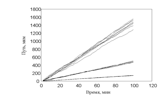 рис. 12 Зависимость пройденного пути от времени. Три группы клеток (max_step: 3, 10, 30 mcm - соотношение 15:30:55) Показано движение 15 клеток из 30, которые генерировала модель. Наиболее удивительным в эксперименте был факт постоянной скорости движения клеток в течении всего эксперимента, не смотря на случайный характер их движения. Модель хорошо воспроизводит этот факт, при этом случайные колебания скорости практически незаметны. Каждая отдельная кривая представленная на рис. 12 хорошо соответствует экспериментальным данным рис. 13 . Однако из сравнения рис. 12 и рис. 13 видно, что в эксперименте существуют все варианты скоростей движения, а в модельном эксперименте, четко выделяются три группы клеток.