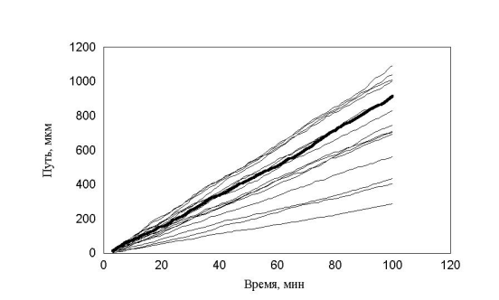рис. 16 Зависимость пройденного пути от времени. Клетки распределены непрерывно (max_step: 30 mcm, соотношение случайное, время измерения каждый шаг) В результате она смешивала все клетки и строила гистограмму