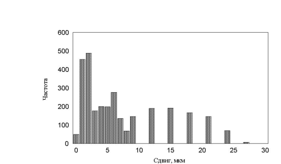 рис. 10 Траектория движения клетки. Вычисляются квадраты расстояния gik , т. е. между i-тым и k-тым положениями клетки. Для каждой заданной разници n = k – i усредняются вдоль траектории все квадраты gik . При исследовании движения популяции клеток было обнаружено, что нейтрофилы, выделенные из одной и той же пробы, движутся с различными скоростями. Этот факт может объясняться многими причинами, главные из которых, по видимому, является возраст клеток, но мы не будем подробно изучать зависимость клеток от возраста. Экспериментатор, условно разделил клетки на медленные, средние и быстрые. Количество таких клеток в популяции составляет 15 : 30 : 55. При моделировании популяции мы исходим из этого соотношения. Программа генерировала случайное количество быстрых, средних и медленных «клеток», в среднем дающих экспериментальное соотношение. При моделировании клеток в популяции, экспериментальный шаг (шаг за единицу времени) случаен. Распределение этих шагов, задается распределением, показанным на рис. 11 .