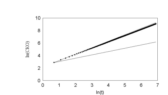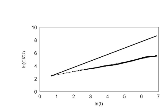 рис. 20 Расномерное распределение углов. На этом рисунке по оси ординат отложен ln времени. По оси абсцисс отложен ln среднеквадратичного отклонения клетки. Как показано Энштейном и Смолуховским для броуновской частицы, эта зависимость отображается прямой с наклоном 0,5. Как видно, наша кривая хорошо ложится на прямую с наклоном 0,5. Для сравнения, на этом же графике проведена прямая с наклоном 1. Если бы клетка не поворачивалась вообще, то её среднеквадратичное отклонение легло бы на прямую с наклоном 1. Результат показан на рис. 21 .