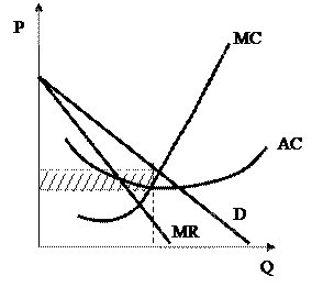 Индекс Херфиндаля-Хиршмана используется правительственными органами регулирования экономики в качестве легального ориентира антимонопольной политики. Так, в США с 1982 г. IHHстал основным ориентиром при оценке допустимости разного рода слияния предприятий. Этот индекс (и его изменение) используются для классификации слияний в три широких класса [16]. Если IHH < 1000 рынок оценивается как неконцентрированный («достаточно многочисленный») и слияние, как правило, беспрепятственно допускается. При 1000 < IHH <1800 рынок считается умеренно концентрированным, но если IHH > 1400 его оценивают как «угрожающе немногочисленный». Это может вызвать дополнительную проверку допустимости слияния Департаментом юстиции. При IHH > 1800 рынок считается высококонцентрированным, или «немногочисленным». В этом случае действуют две нормы. Если в результате слияния IHH увеличивается на 50 пунктов, оно, как правило, разрешается. Если же после слияния IHH увеличивается более чем на 100 пунктов, оно запрещается. Рост IHH на 51-100 пунктов является основанием для дополнительного изучения допустимости слияния. 1.4 Монопольное равновесие Наиболее благоприятным на рынке чистой монополии является положение равновесия монополиста. Этот крайний случай, как бы редко он ни встречался в своей наиболее чистой форме, легко поддается графическому анализу. Для того, чтобы проследить за состоянием монопольного равновесия, рассмотрим графическое изображение рынка чистой монополии: